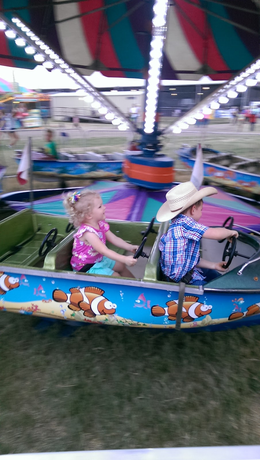 After we walked around and checked everything out, we headed back to the rodeo arena to sign Levi up for mutton bustin'. We were only third in line so he would have made the list, but when I found out that the event wouldn't happen until about 9:15 pm (it was only 6:15 at the time), we said no way, Levi's not going to make it that long. He no longer takes naps and has always been an early to bed, early to rise kind of kid. So we didn't sign him up. We went back over to the fair and bought tickets so the kids could do some rides.